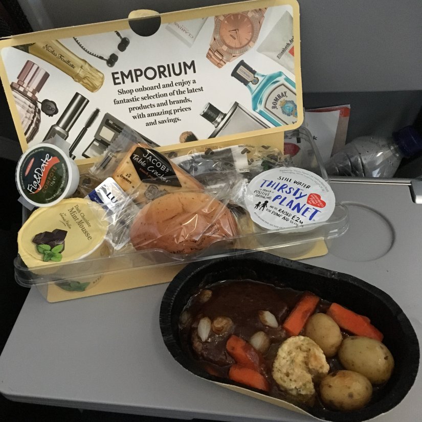 Around 2 hours before landing we were served afternoon tea which comprised of 2 finger sandwiches (cheese & onion and egg & cress), a mini packet of Hula Hoops, lemon drizzle cake and a soft drink. It was pleasant enough and came in at only 385 calories in total (I’d been sat down for 7 hours at this point so yes, I added it up)! It was what it was, served chilled and inoffensive!