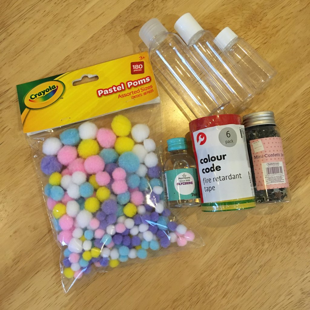 1) Put your sequins etc. in to the empty bottle. Add a combination of different textures and colours as they will all act differently once submerged.