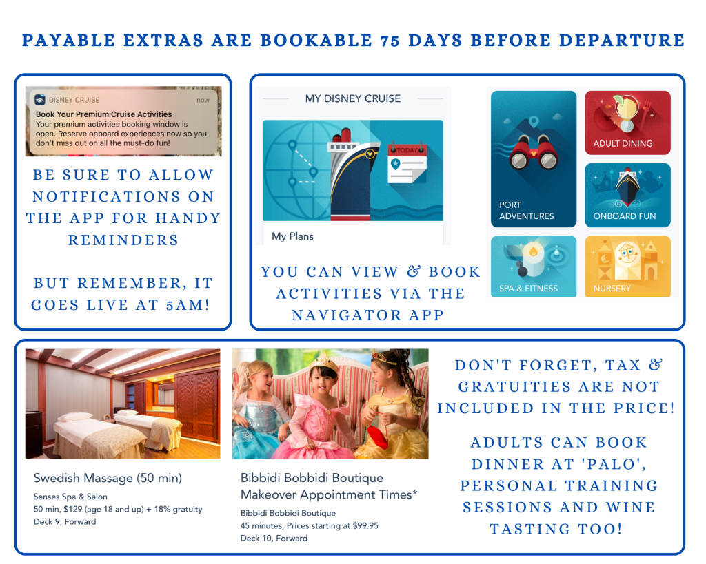 I am not going to go in to detail about any of these as I have not booked or had any experience with these, plus there is loads of information on the Navigator app and the Disney Cruise Line website. All I will say is that they are priced in US Dollars, and many will be the price + tax (20%), + tips (18%). Make sure you read the small print.