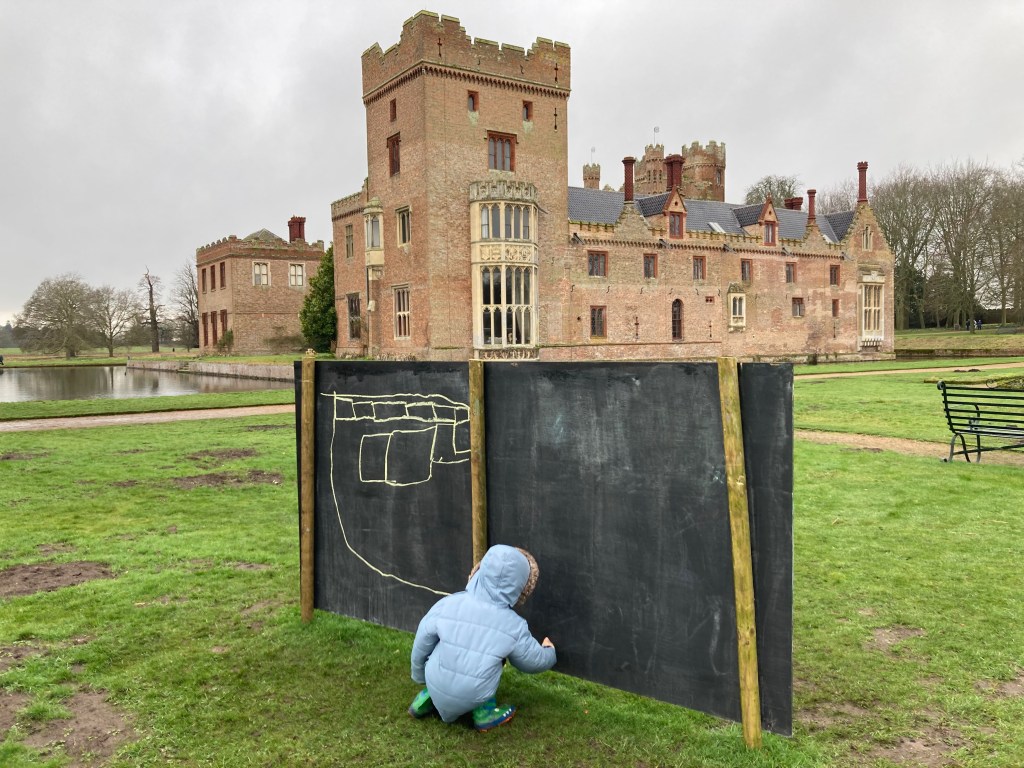 On face value, it would appear that Oxburgh Hall is not geared up for families. There isn’t a big play area, no shows or treasure maps. But if you have an open mind and a little imagination, this can be a fantastic and educational day out. Our son is only 4, and whilst he may not know much about history, we did have a great time creating a story about the king that lived in this castle. We looked for him all around the house, even looking to see if he was having a sleep in his bedroom, but he must have been away on holiday as we couldn’t find him anywhere! We talked about the story of Rapunzel and how she let down her hair, looked for ducks swimming around the moat and jumped in some pretty epic muddy puddles. Oxburgh Estate also provides free explorer bags which you can borrow from the main entrance, containing useful things like magnifying glasses to help you spot wildlife. There is also an area on the wider estate designated for den building, plus additional activities in the school holidays. When we visited, there was a giant chalk board to get creative with. They also have activity or colouring sheets in the cafe to keep little ones busy whilst you sample some delights from the menu. All-in-all, we had a fantastic day, and Teddy was suitably tired when we got back in the car! Just be careful in the gift shop – they have some adorable soft toys on offer and we did not escape with all of our money!